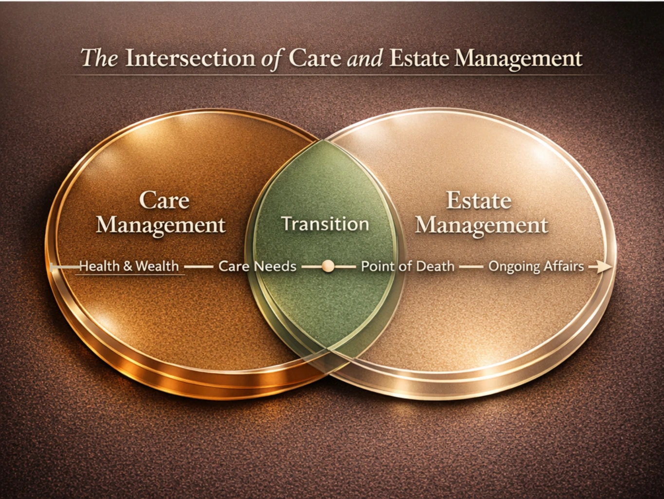 Estate Management focuses on the financial aspects of the person (Wills, Trusts, Financial POAs, etc.) with dedicated executors or trustees whereas Care Management focuses on the healthcare of the person (EHCD, AHCD, Medical POA, etc.) with designated caregivers or proxies. The procedural overlap between wealth and health matters lie inextricably linked to and overlapping the point of death.